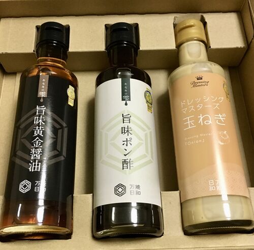 日本最大級のお取り寄せサイト『お取り寄せネット』でお取り寄せできる 万能日和金賞受賞人気3本セット(調味料)のご紹介☺ 万能日和金賞受賞人気3本セット(調味料) 旨味ポン酢 旨味黄金醤油 ドレッシングマスターズ「玉ねぎ」 万能日和金賞受賞人気3本セッ…